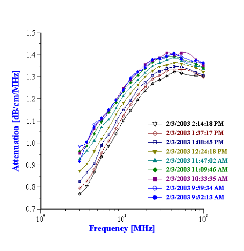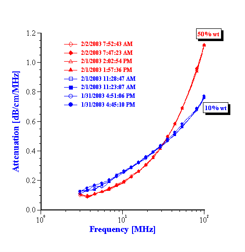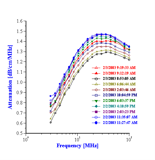 It turned out that attenuation at low frequency decays with time, reaching stable level roughly after 30 hours. Attenuation at high frequency remains practically unchanged, at 100MHz it is 0.457 dB/cm/MHz with standard variation of only 0.006 dB/cm/MHz .