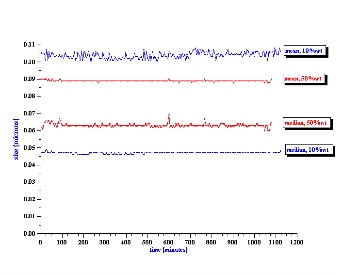 Figures S.3, 5 and 6 illustrate particle size distribution calculated from attenuation spectra. Statistical analysis reveals that standard deviation of the median particle size characterization is 0.4 nm for 10% slurry, and 1 nm for 50% slurry. Standard deviation of the mean particle size characterization is 2 nm for 10% slurry and 0.3 nm for 50% slurry. This allows us to formulate the next conclusion.