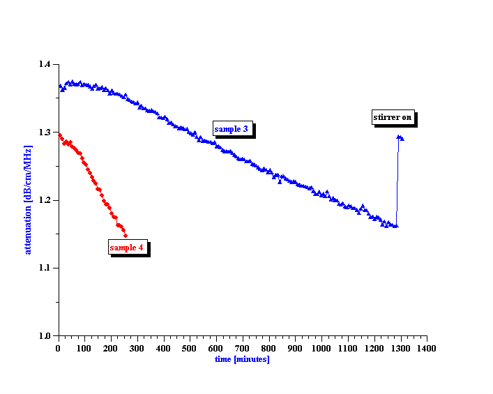 Starting measurements of attenuation under stirring conditions reveal very unusual attenuation curve. It is shown on Figure A.1, the highest attenuation reaching 4 dB/cm/MHz at low frequency. Normally we attribute this high attenuation at low frequency to bubbles. However, bubbles attenuation is not that much reproducible as we observe here.