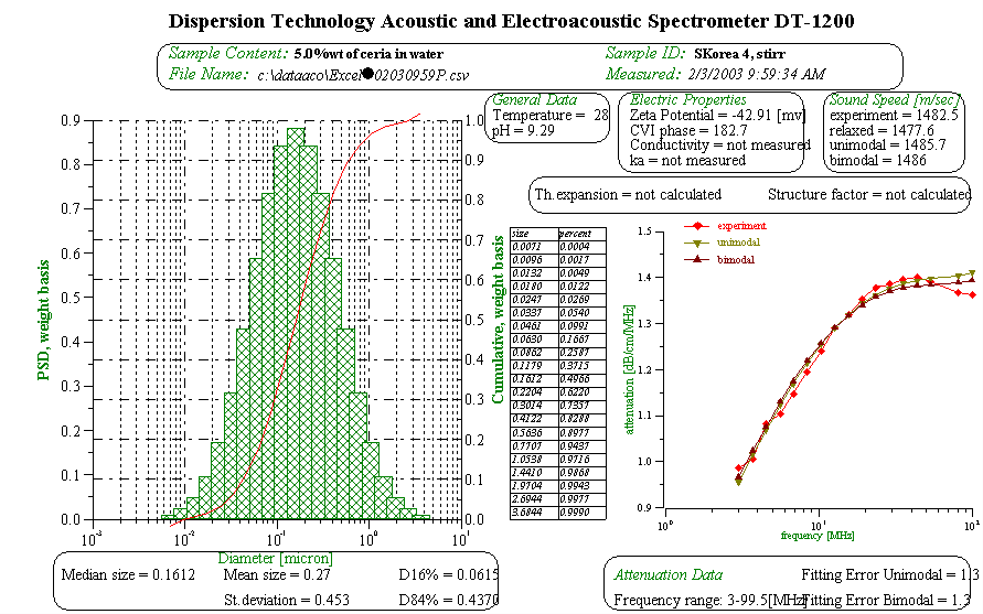 There is one important innovation in the way we apply Acoustics and Electroacoustics here. Usually, Acoustic spectrometer measures individual attenuation frequency spectra (raw data) with further particles size distribution (PSD) calculation, using appropriate theory. Electroacoustic instrument measures electroacoustic signal (either CVI or ESA) that provides information about zeta potential.